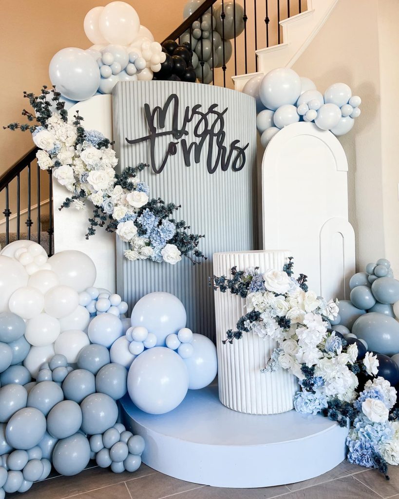 - An elegant balloon installation in varying shades of blue paired with crisp white accents, with centred signage featuring, “Miss to Mrs”, “Bride to Be” or “Something Blue Before I Do”.