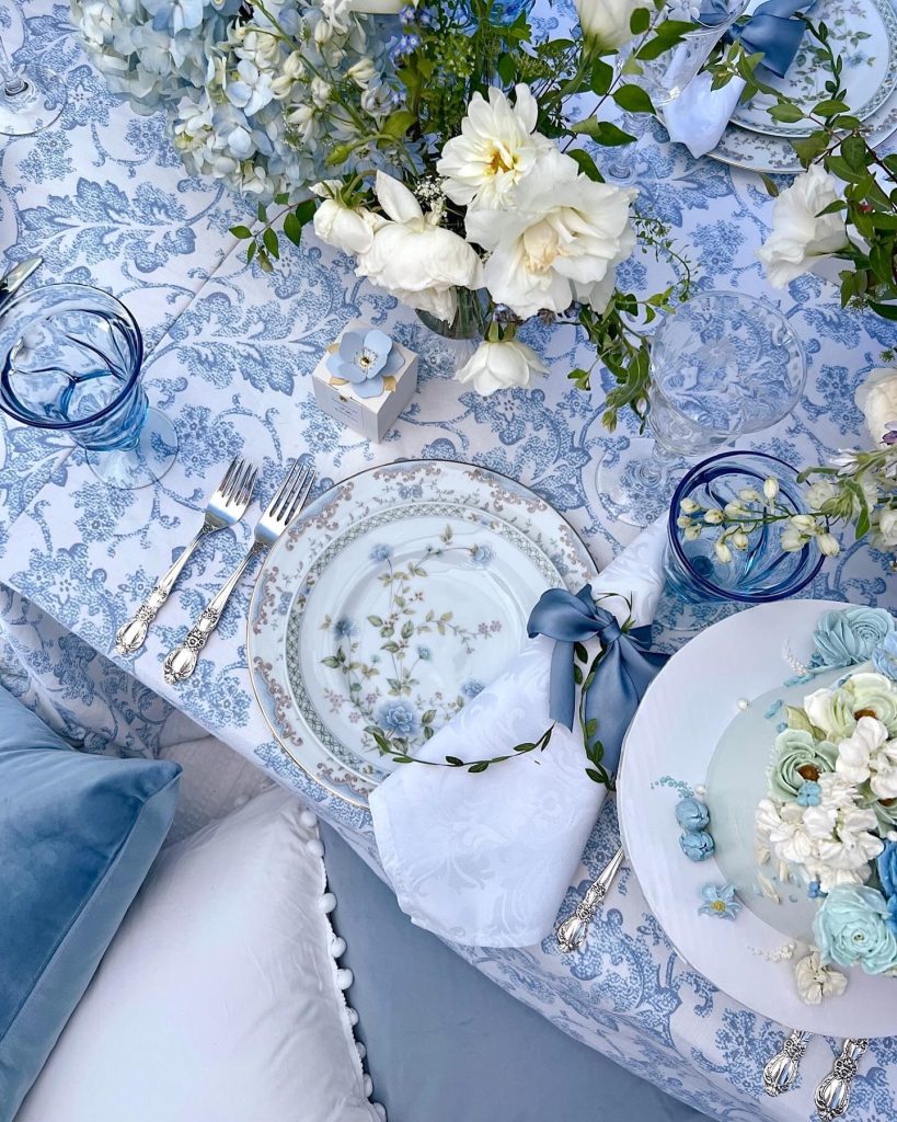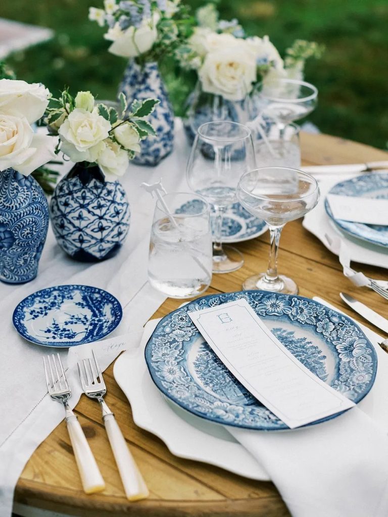 Layer blue and white chinoiserie plates with crisp white linens and crystal stemware. Add a blue table runner, patterned chargers, and coordinating blue napkins with chiffon ribbon ties. Small floral arrangements in mixed blue and white vessels serve as elegant centerpieces for a fresh aesthetic.