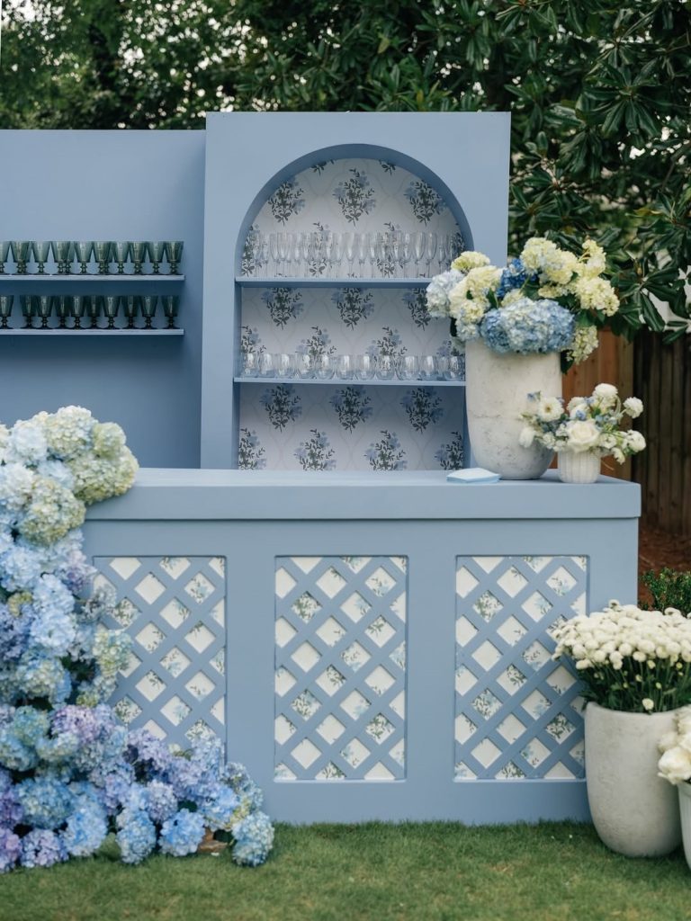 Picture chinoiserie table settings with hydrangeas and roses spilling out of ceramic vases. A “Before I Do” backdrop sets the scene for photos, while a lounge area invites intimate conversations.