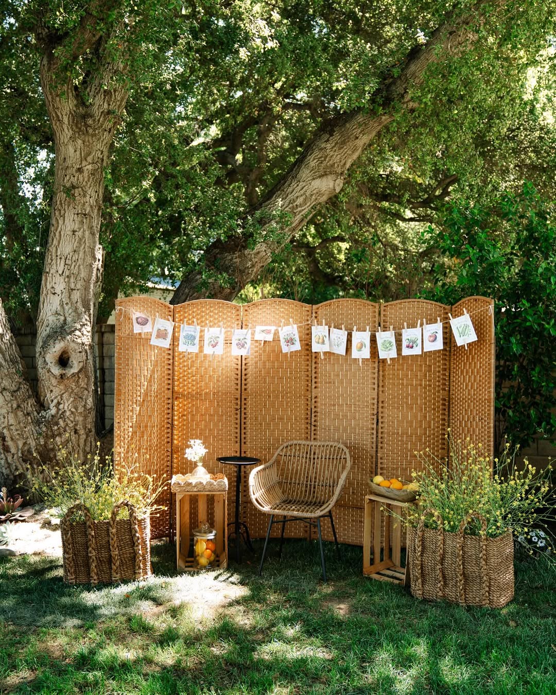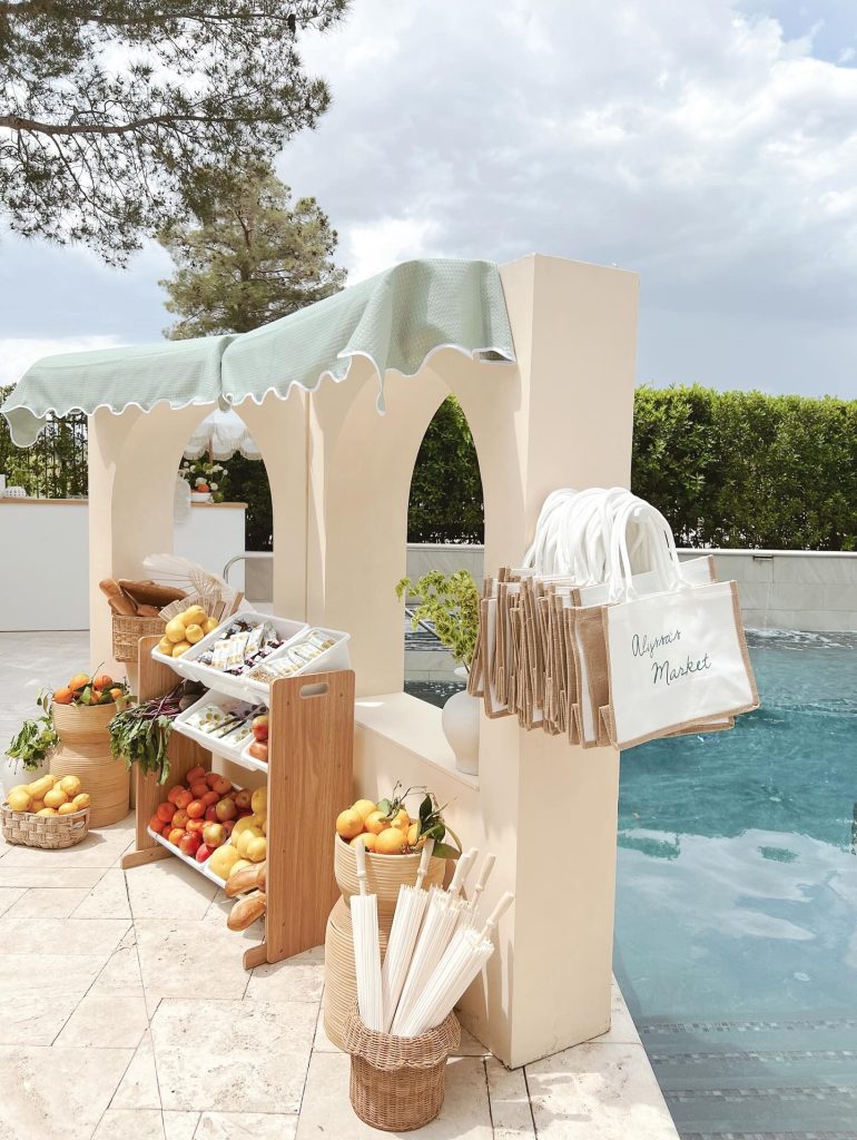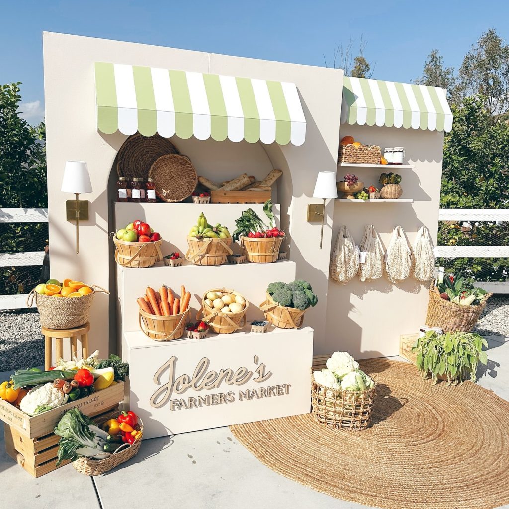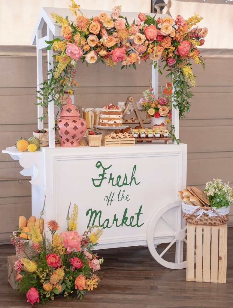 Think wooden crates and wicker baskets overflowing with seasonal produce beneath striped awnings, herbs and vegetables serving as natural table decor atop gingham linens, and a “She’s Fresh off the Market” sign as a welcome and photo backdrop.