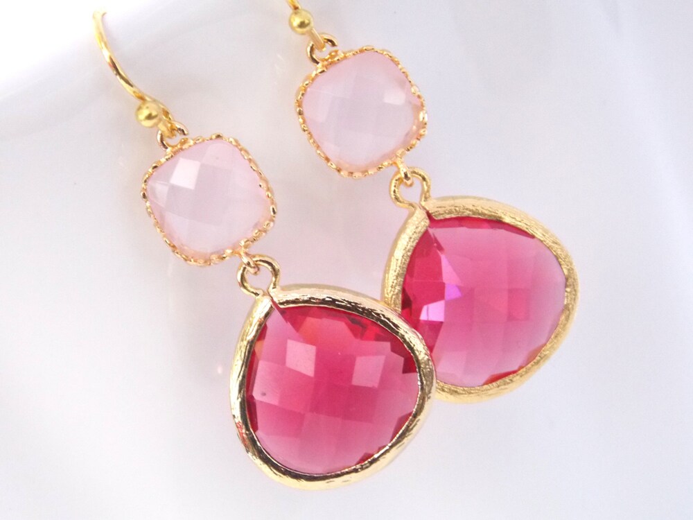 These stunning glass gold earrings blend ice pink and fuchsia colours for an absolutely gorgeous accessory perfect for bridesmaids. Each pair features beautiful pear-shaped faceted briolettes suspended from gold plated ear wires, with square top glass beads adding extra dimension and sparkle. Your friends will adore receiving these elegant earrings lovingly packaged ready to gift.