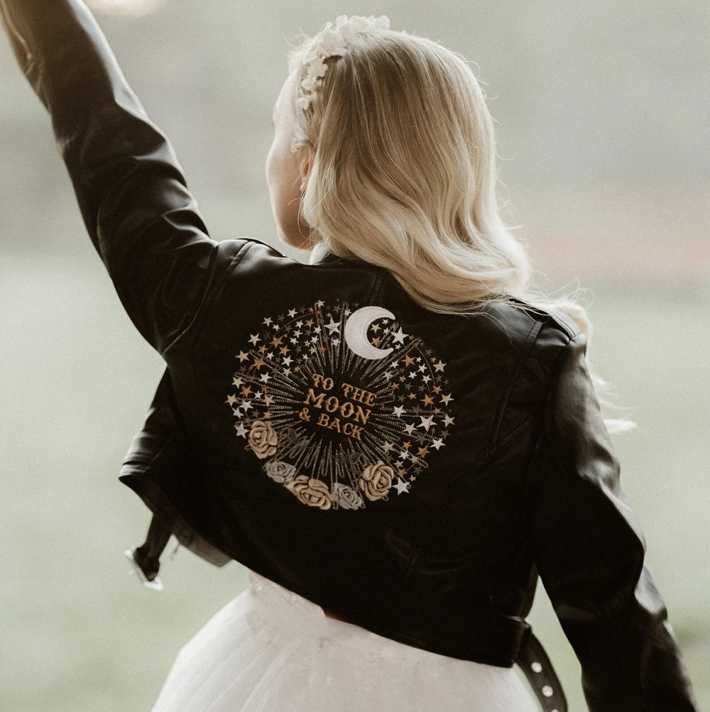 “To The Moon and Back” Embroidered Black Vegan Leather Bridal Jacket
