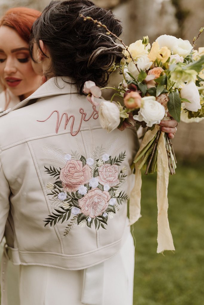 As well as being practical, your jacket is a standout wedding day accessory for your couple portraits. Change up your look, show off those beautiful personalised details and capture the artistry of your custom piece on camera.