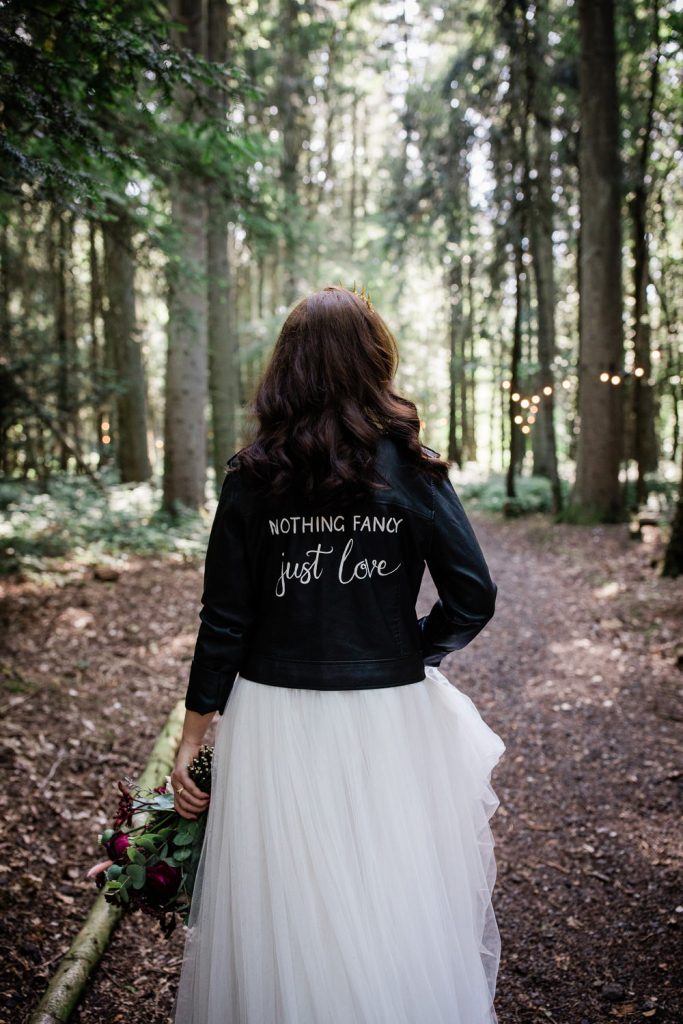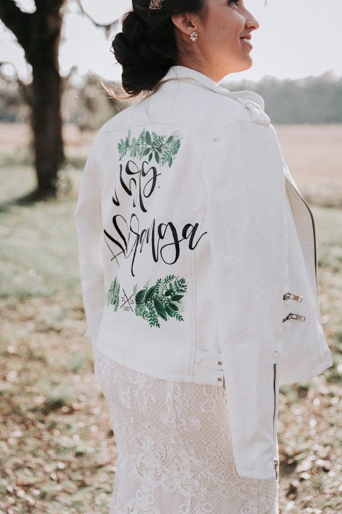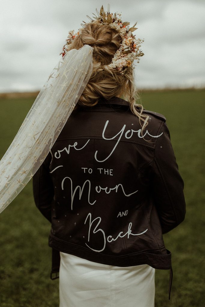 Your custom jacket is the perfect coverup for an outdoor ceremony in cooler weather. Stay cosy in style as you exchange vows surrounded by nature, or throw it over your shoulders for your walk back up the aisle after you’ve officially tied the knot.