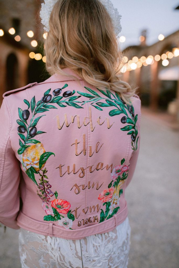 For the artistic couple looking to create a romantic keepsake, custom calligraphy or illustrations can turn your jacket into a one-of-a-kind work of art. Whether you commission a painter to adorn your jacket with personal symbolism or have a calligrapher add flourishing text, this allows you to share your love story with clothing as your canvas.