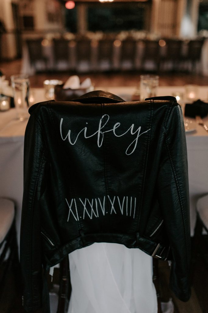Once the formalities are over, a custom jacket adds a fun detail to your wedding reception entrance and looks just as good slung over the back of your chair to mark your seat. Your photographer will be on the lookout for cute reception moments just like this!