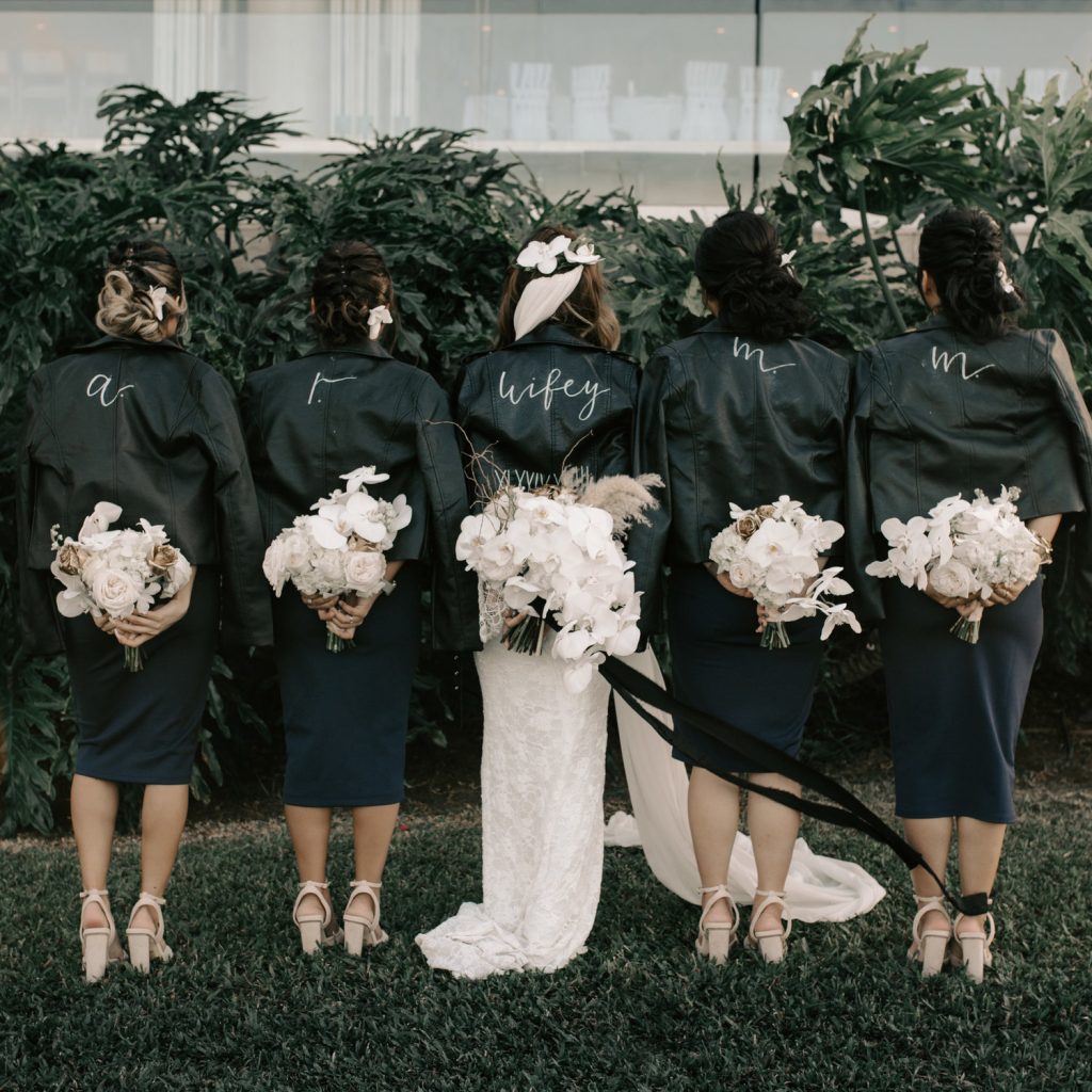 If you’re all about making a bold statement, a leather wedding jacket brings the rock n’ roll vibes! A classic black or white biker jacket brilliantly contrasts with sleek suits or flowing gowns, making it a perfect pick for couples who love the unconventional.
