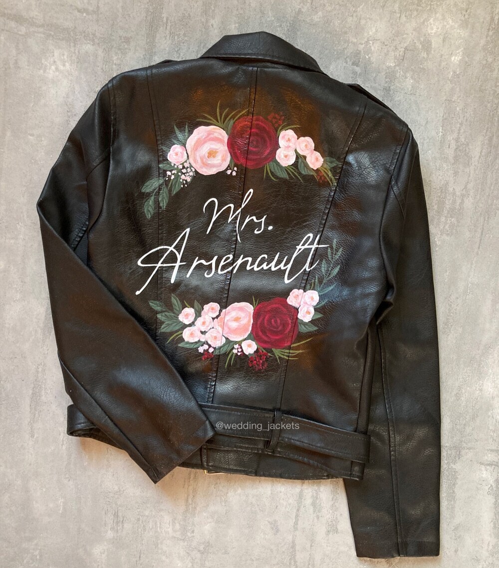 This customizable faux leather jacket is hand-painted and can incorporate names, dates or custom artwork to match your wedding aesthetic. Special leather paints ensure lasting quality with proper care and maintenance.
