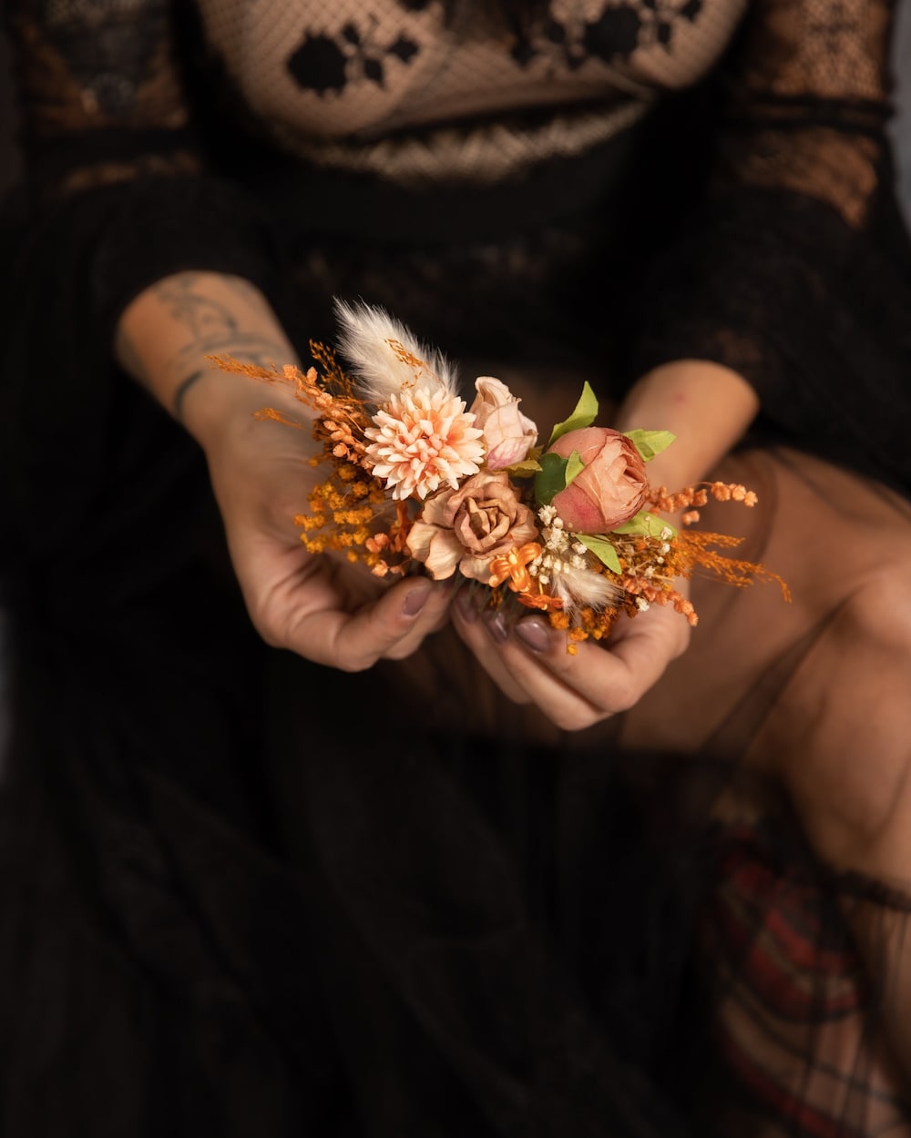 This lovely bridal hair comb features artificial flowers, leaves and grasses in peachy and autumn hues. A delicately detailed accessory for your wedding hair.