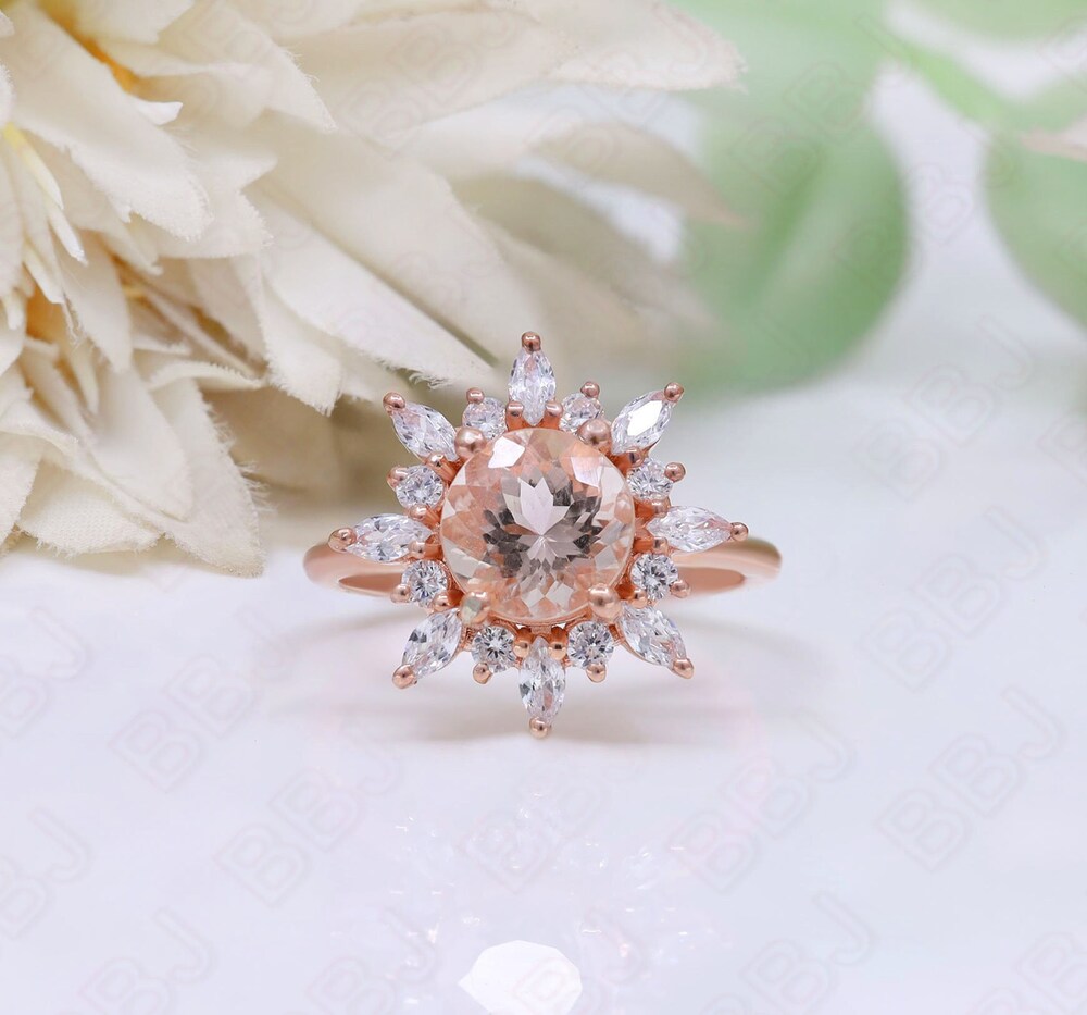 This lab created peach morganite engagement ring with a halo of moissanite stones is beautifully set on a rose gold band.