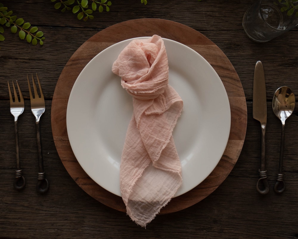 This set of four peach toned wedding napkins are made from a lovely soft cheesecloth and are perfect for wedding table settings from rustic or boho to whimsical. Hand dyed with raw edges and 100% cotton and available in a variety of colours.