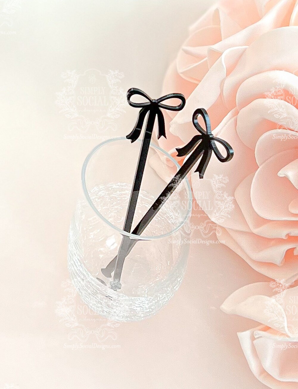 These elegant black coquette bow acrylic drink stirrers add a charming touch to beverages and are perfectly sized for cocktails and other party drinks. Made from high-quality black acrylic and sold in convenient sets, the stirrers create Instagram-worthy drinks that guests will love. Your bar area will look professionally styled with these sweet accessories that combine functionality with the perfect look for your bridal shower, bachelorette party or themed event.