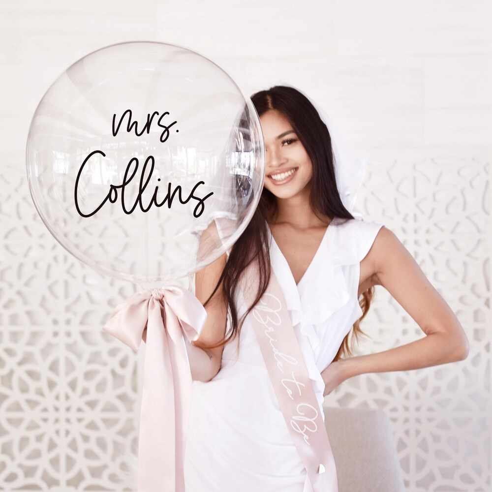 This clear “Mrs…” bridal shower balloon makes a great photo prop with personalized vinyl decal featuring the bride’s new last name in elegant black script. You can use your own balloon or add the included crystal clear balloon that’s perfect for filling with confetti or decorations. Your photos will be Instagram-worthy with this fun prop that stands out beautifully and creates memorable, fun moments for the bride-to-be.