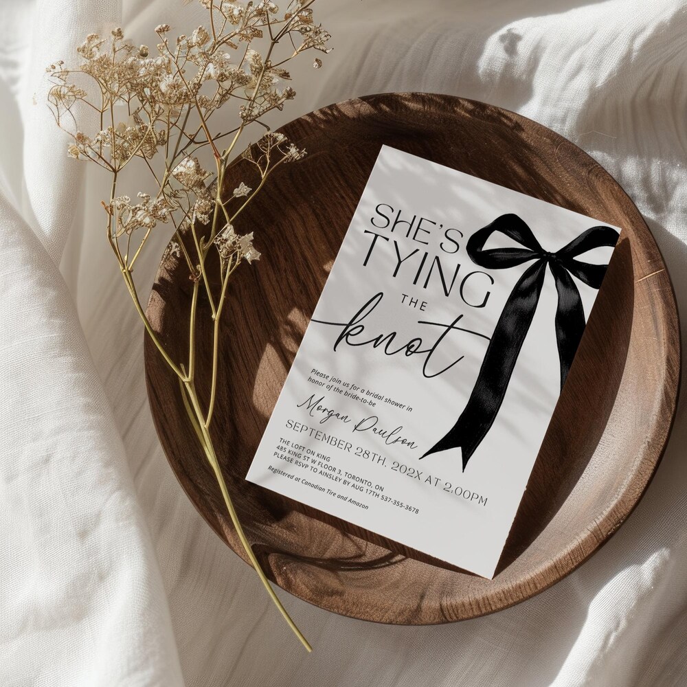 “She’s Tying the Knot” Watercolor Black Bow Bridal Shower Invitation, Print or Digital Download