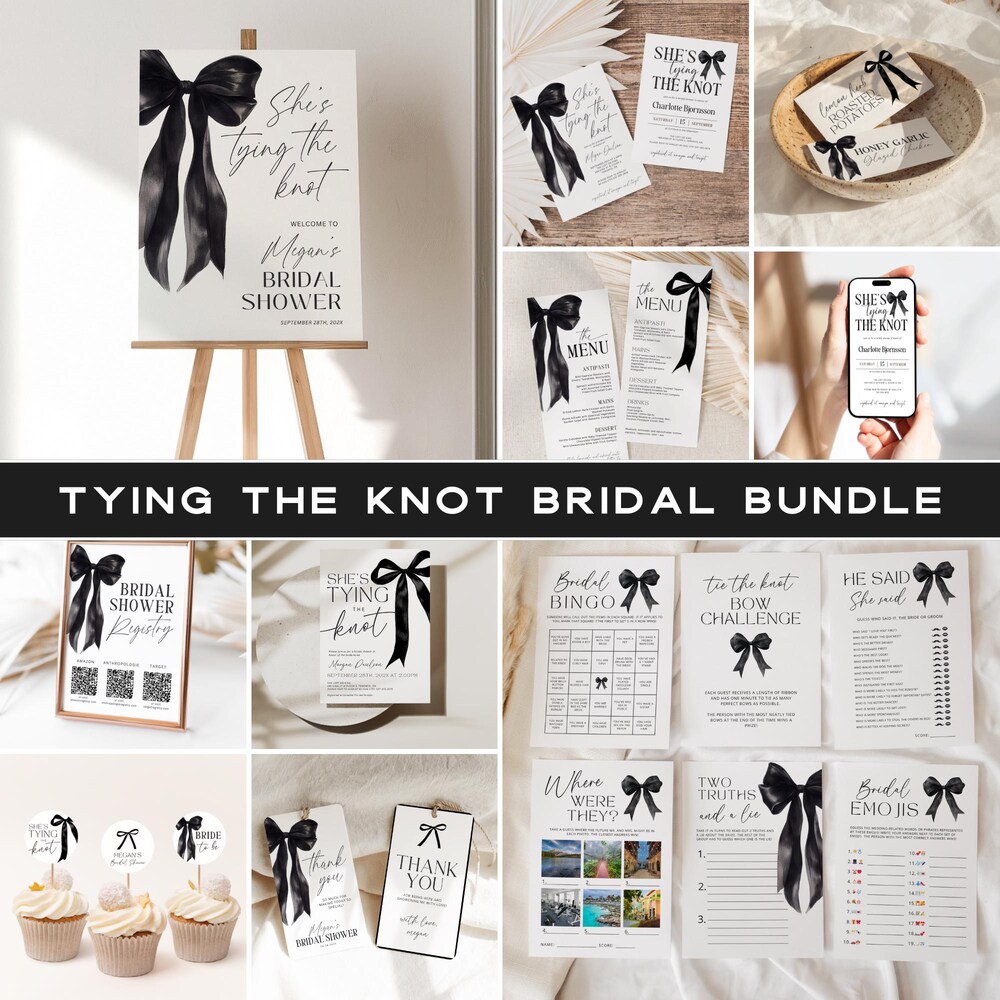 This comprehensive bridal shower template bundle features elegant black watercolor bow designs in the “She’s Tying the Knot” theme with over 44 customizable pieces including invitations, welcome signs, games, and party decorations. Everything is easily editable in Canva, allowing you to personalize text, fonts, and colors to create a cohesive and sophisticated celebration theme. Your guests will be impressed by the coordinated elegance that transforms your bridal shower into a memorable, picture-perfect event.