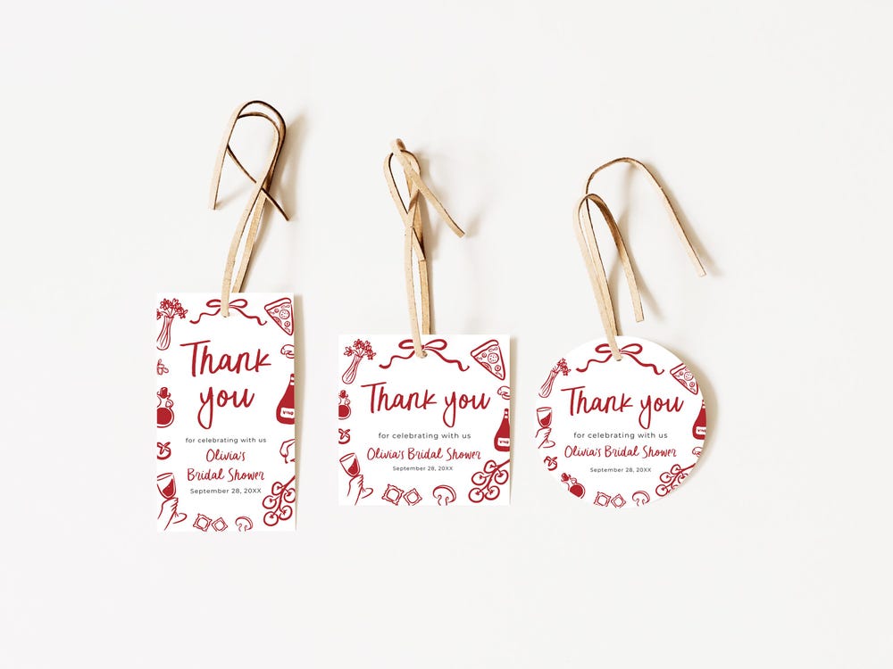 That’s Amore Bridal Shower Favor “Thank You” Tags, Whimsical Red Hand Drawn Italian Food & Wine, Digital Download