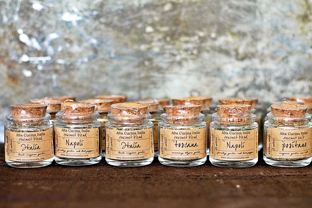 These unique hand-blended salt and spice seasonings make exceptional party favors with authentic Italian flavors crafted from the finest quality herbs and Sicilian sea salt. Each blend comes in a charming round glass jar with cork top, featuring delicious combinations like Toscana rosemary-thyme-garlic or Sorrento sundried tomato blend. Your guests will love these artisanal, all-natural seasonings that bring the authentic taste of Italy to their home kitchens long after your “That’s Amore” bridal shower celebration ends.