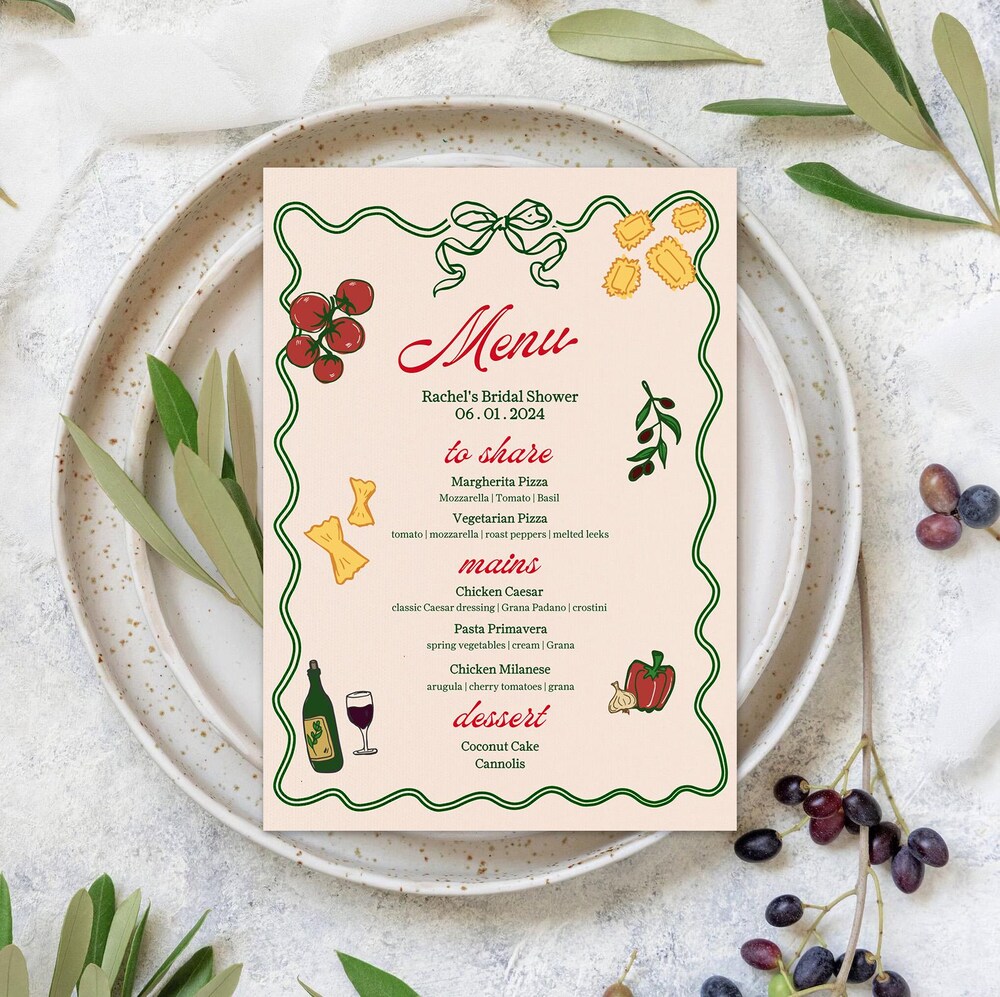 Colorful “Thats Amore” Bridal Shower Menu Digital Download with Hand Drawn Pasta, Tomatoes, Wine, Olives, Garlic, Bell Pepper, Ribbon Bow Border