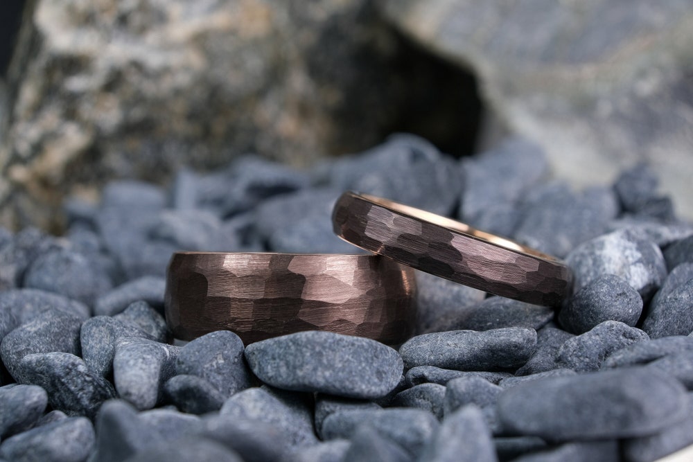 These distinctive hammered mocha brown tungsten wedding rings feature a luxurious rose gold interior. The rugged hammered finish creates a striking contrast with the elegant rose gold, while the comfort-fit design ensures they’ll feel as amazing as they look. Each ring is crafted from genuine tungsten carbide for lasting durability and comes with complimentary engraving to make them truly yours.