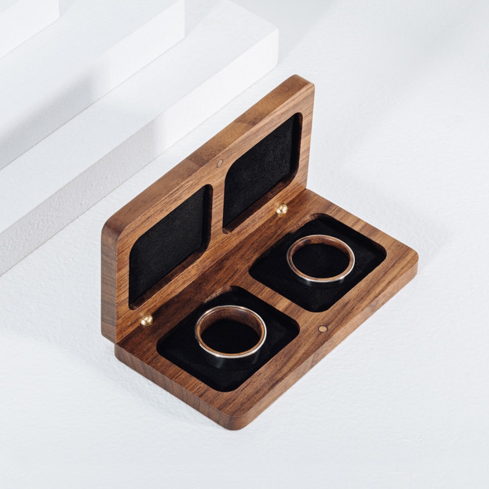This slim line walnut wedding ring box is handcrafted from sustainably sourced timber, designed to hold your rings snug and secure and fit easily into your pocket. Personalised engraving is available and each box is made to last a lifetime!