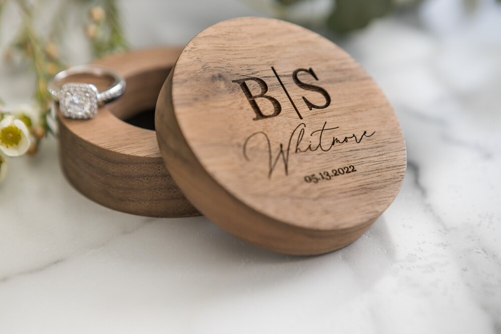 Pop the question with this beautiful round wedding ring box! Use it later on your big day to exchange vows. Each custom box is laser engraved to your specifications and made from premium walnut. Fits both his and her wedding rings for easy and secure storage.