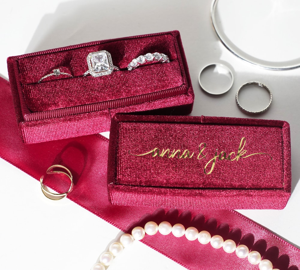 This personalized velvet triple ring box makes a stylish home for your rings after your wedding and also a great wedding gift!