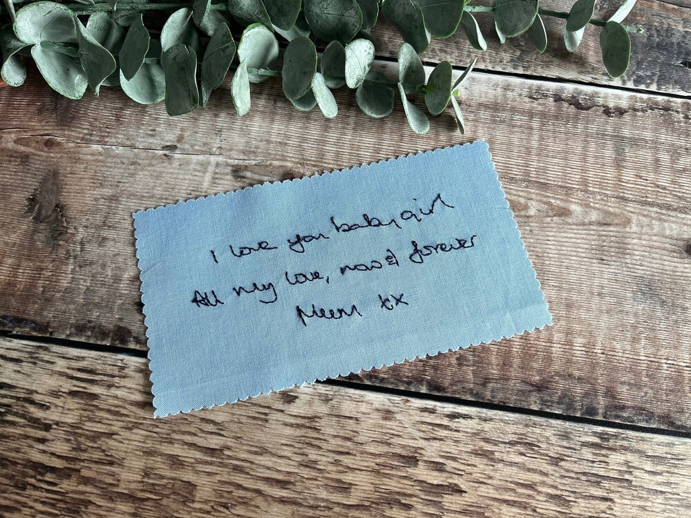 This custom wedding dress patch is a beautiful way to keep your loved one close as you walk down the aisle. Transform their handwriting from notes, greetings cards or letters into a precious label you can pin or sew into your wedding outfit. Handstitched on blue cotton fabric, it’s a sentimental ‘Something Blue’ for your celebration.