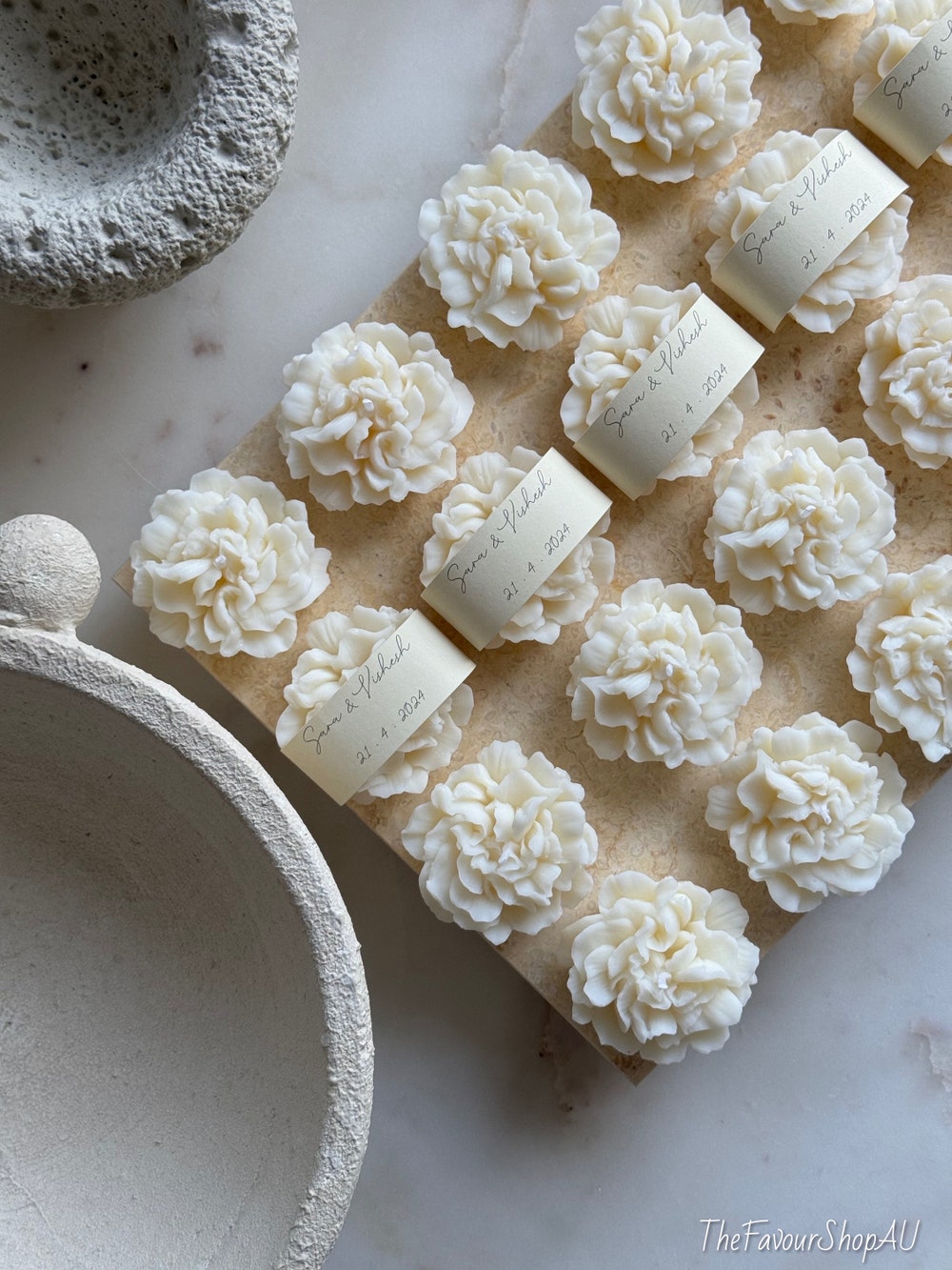 These beautiful hand-poured mini flower candles make elegant and fragrant wedding favours your guests will treasure. Each 5cm x 2cm blossom-shaped candle weighs approximately 25g and is available in various fragrances including an unscented option, all individually bubble-wrapped for protection. Complete with optional personalised cream-coloured tags, these charming candles add an extra touch of romance and sophistication to your celebration.