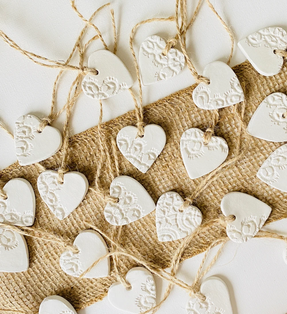 These unique handmade clay hearts make charming and memorable wedding favours that add a personal touch to your celebration. Each 3.5cm x 3.5cm heart features a beautiful lace imprint, tied with rustic twine, creating a delicate keepsake your guests will treasure. Place these sweet tokens on your guests’ table settings as a gesture of appreciation for sharing in your special day. They can be used as sweet Christmas decorations or gift tags. Options for personalisation and custom colours including white or terracotta are available.