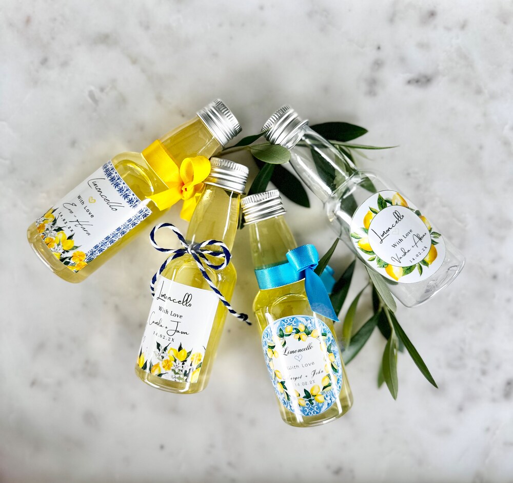 These charming Limoncello shot bottles add a touch of Mediterranean flair to your wedding celebration as a traditional and thoughtful guest bonbonniere. Each bottle holds 60ml of liquid (around three shots) and can be decorated with your choice of blue ribbon, yellow ribbon, white and blue cotton twine, or no decoration for a clean look. Choose from 24 gorgeous waterproof sticker designs to personalise these fill-it-yourself bottles for a favour that brings a taste of the Amalfi Coast to your special day.