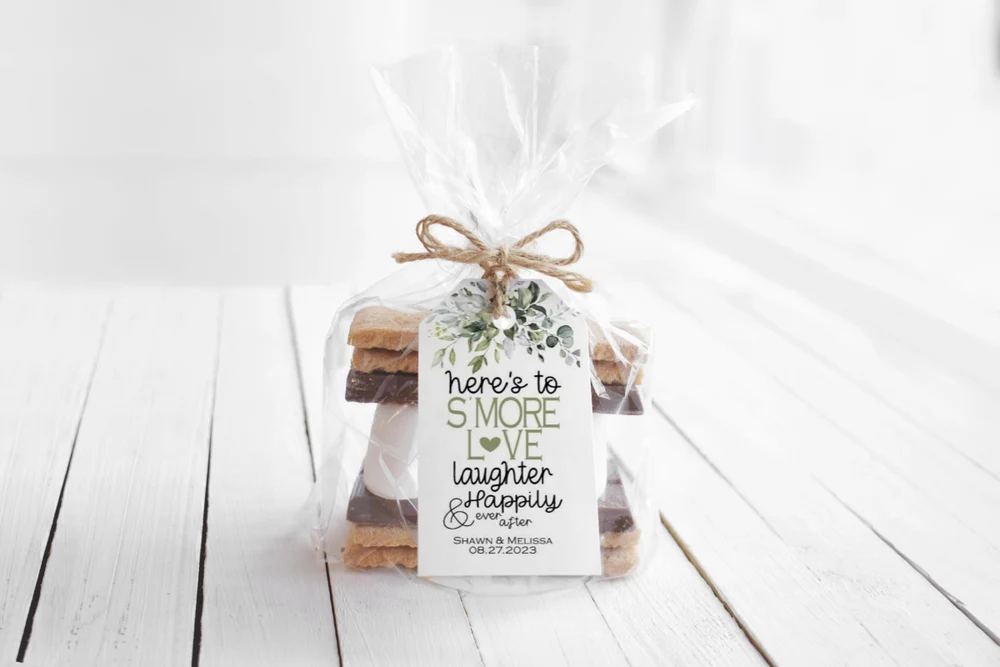 These adorable handmade thank you tags add the perfect personal touch to your wedding favors. Each tag is printed on high-quality white cardstock with “Here’s to S’MORE LOVE laughter & happily ever after” and can be personalised with your names and wedding date at the bottom. The set includes 40 tags with twine, with the option to add clear gusseted polypropylene favor bags if you’d like a complete packaging solution for your special day.