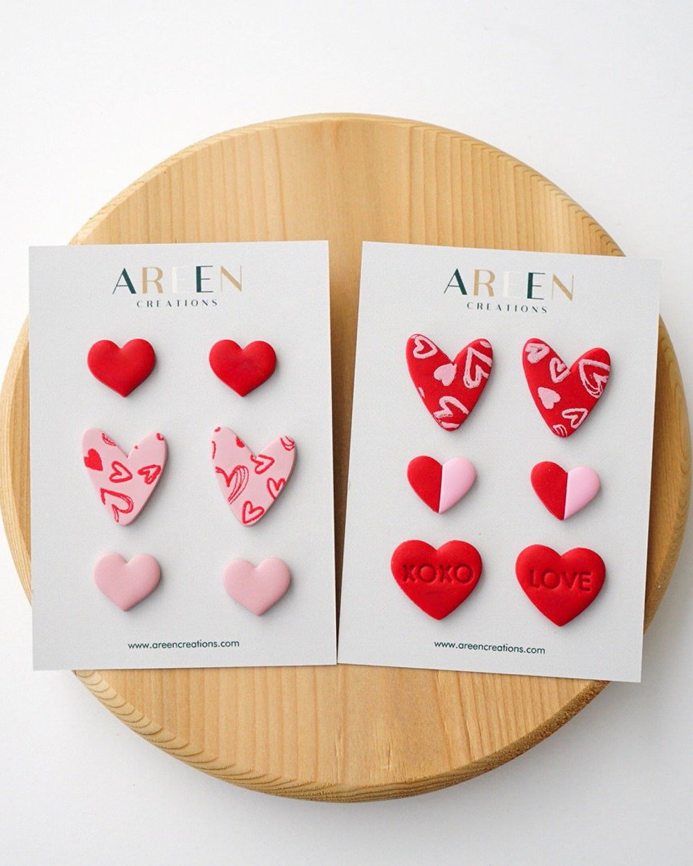 Red and Pink Heart Polymer Clay Stud Earrings Set of 3