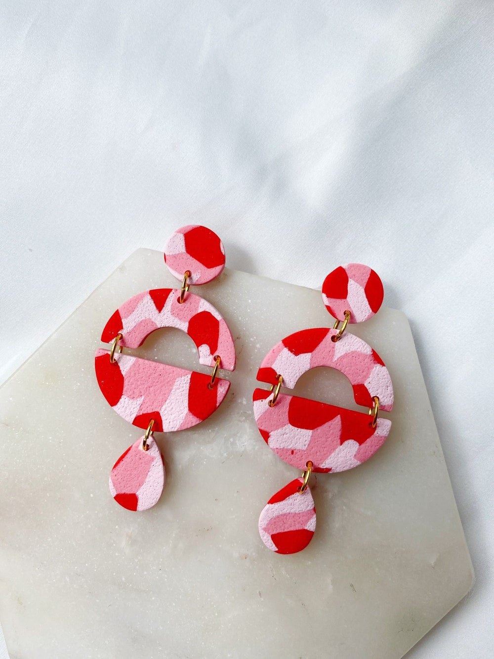 These dangle earrings feature an abstract red and pink pattern on circle, arch, semicircle and teardrop shapes connected by gold jump rings. Handmade from polymer clay, they are comfortable and lightweight to wear all day.