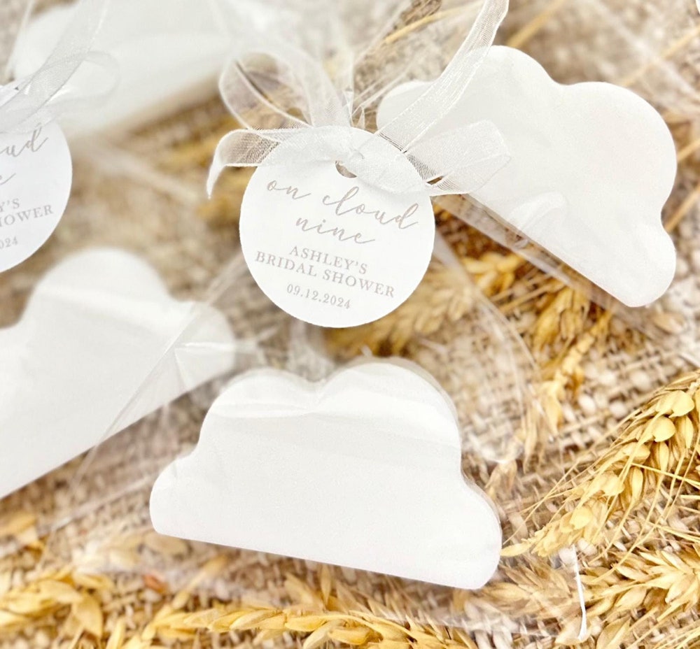 These ethically made cloud soaps are an elegant touch for your bridal shower gifting. Hand made with sustainable, non-GMO ingredients crafted by a loving family business. Each soap comes individually packaged in clear bags with custom tags attached, arriving ready to gift. Perfect for “On Cloud Nine” celebrations!