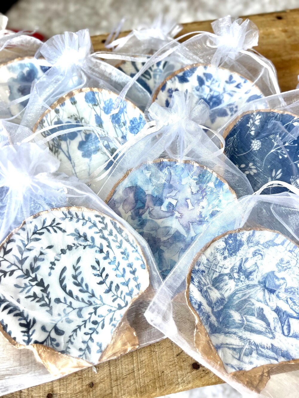 A stunning bridal shower favor your guests will be eager to take home! These blue and white scallop shell ring dishes feature elegant chinoiserie and floral designs with decoupaged detailing and gold leaf painted edges. Each unique shell measures approximately 4.5″ wide and comes gift-boxed with gauze bag wrapping and decorative crinkle paper.Your guests will treasure these versatile favors that serve as beautiful home decor while providing practical storage for jewelry and small treasures.