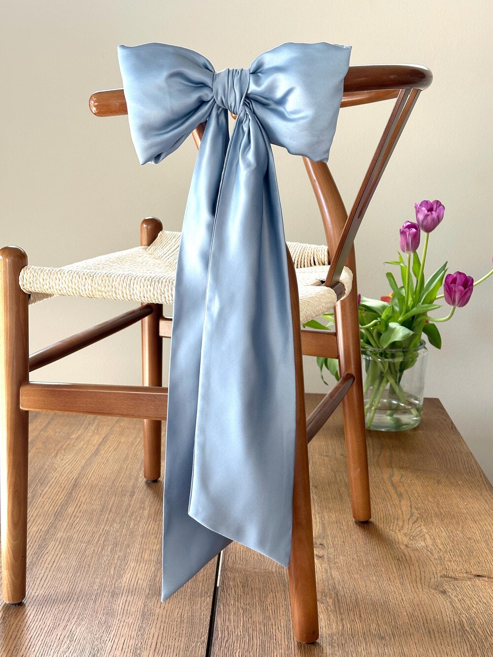 This luxurious satin chair, stair or mantlepiece bow makes a stunning statement piece for any bridal shower or wedding party with its impressive size and elegant material. Made from high-quality satin fabric, it offers custom sizing options to perfectly fit your specific decoration needs.