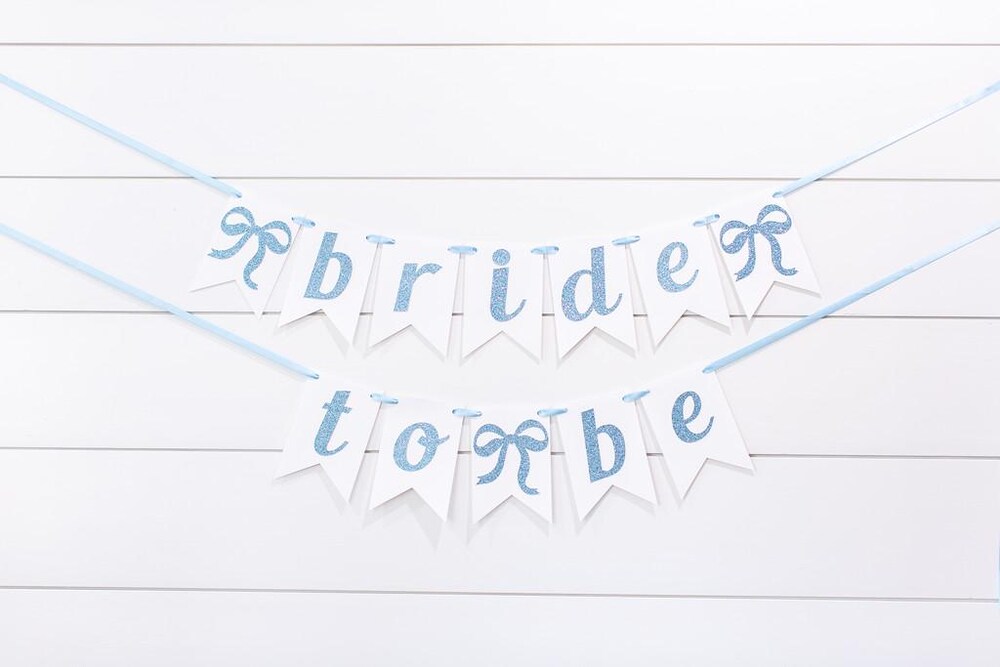 Blue Glitter “Bride to Be” Bridal Shower Flag Banner with Bow Details: Custom Colours Available, Satin Ribbon Included