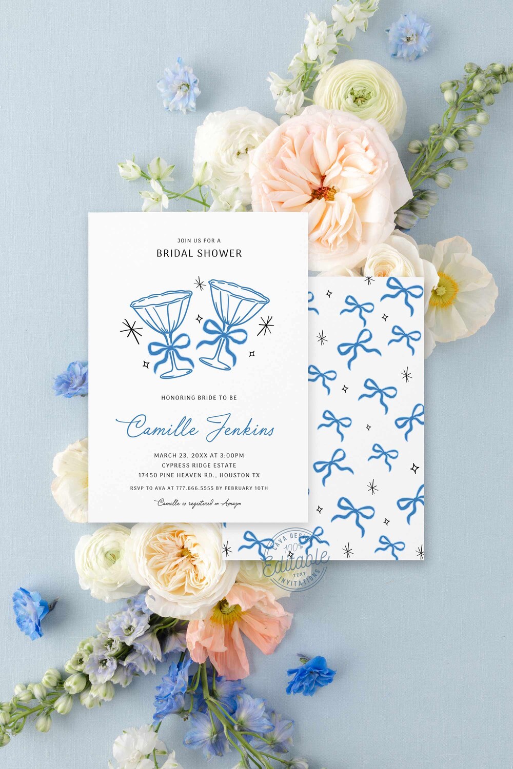 Blue Bridal Shower Invitation Editable Template: Hand Drawn Whimsical Champagne Glasses, Bows & Stars