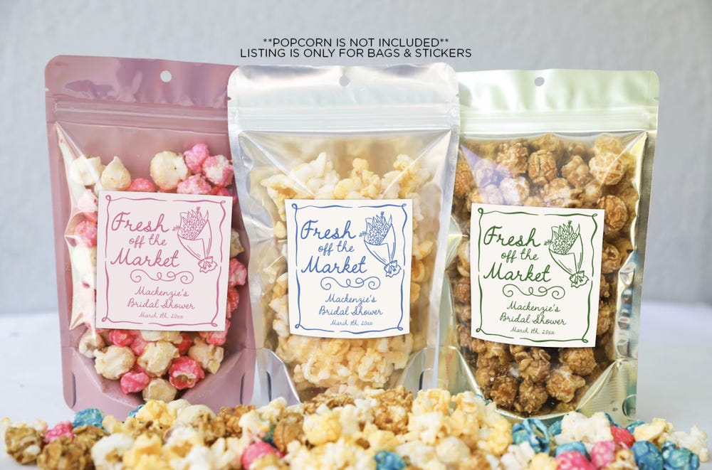 Personalized “Fresh off the Market” Bridal Shower Favor Stickers & Optional Bags: Hand Drawn Illustration Doodle Style