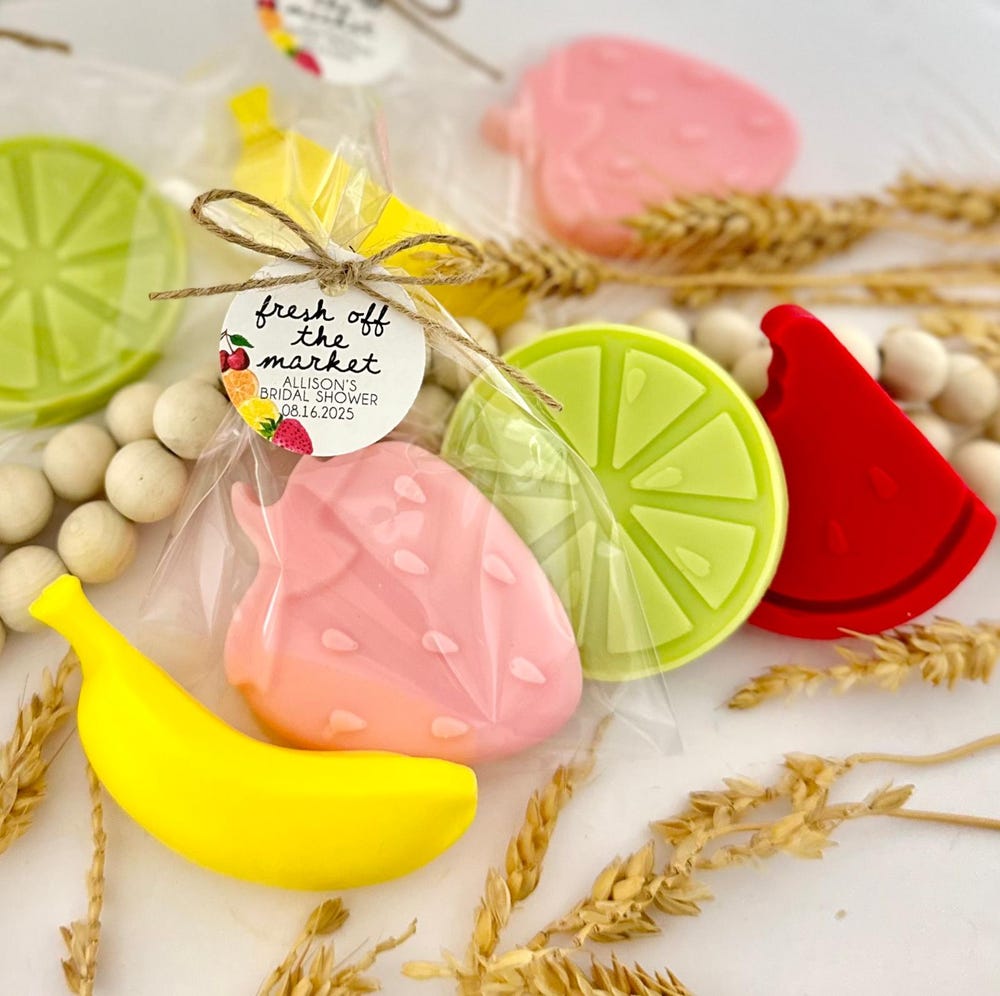 Bridal Shower Fruit-Shaped Soap Favors with Personalized “Fresh off the Market” Tags