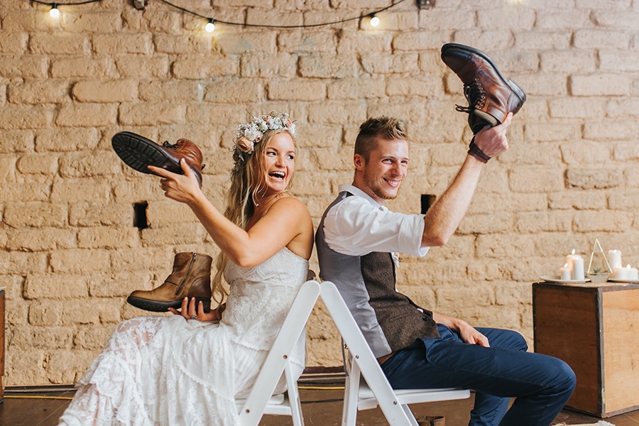 The shoe game is a fun little piece of entertainment where the couple sit back to back, each holding one of their own shoes and one of their partner’s shoes. A dedicated person, usually the MC or member of the wedding party, asks a series of light hearted and silly questions about the couple’s relationship. To answer, the newlyweds must both hold up the shoe of whoever they think fits the answer best. This game definitely has guests laughing!