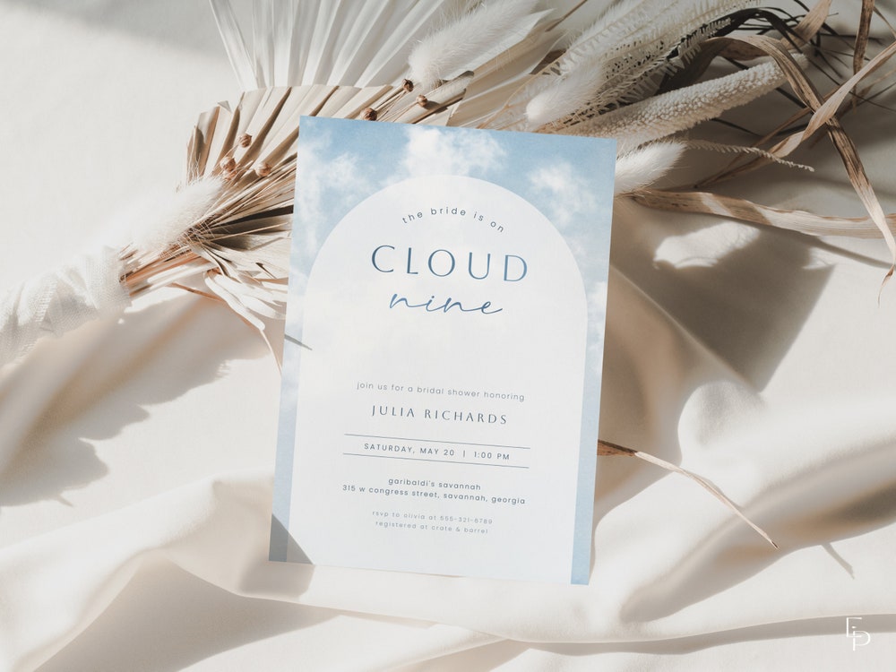 “The Bride is on Cloud Nine” Bridal Shower Invitation Digital Download, Blue Sky, Clouds and Arch Design