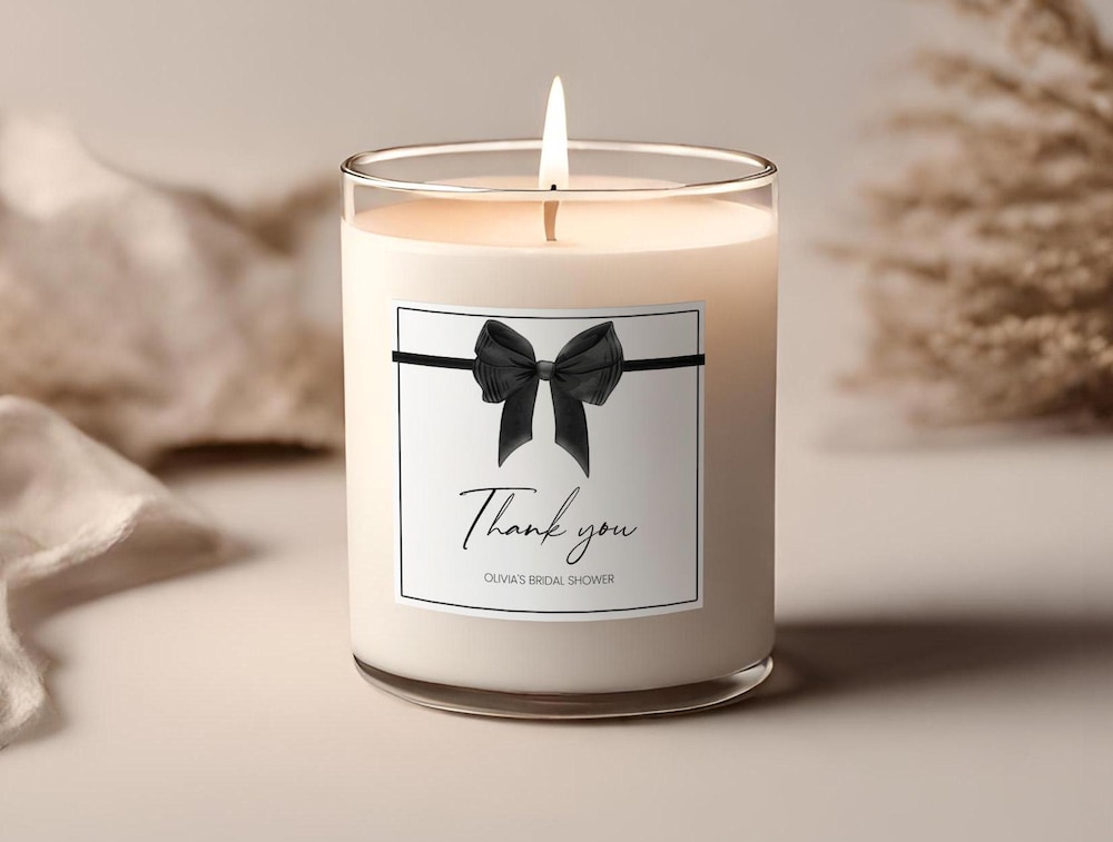 These elegant printable labels are in a sophisticated, minimalist design with clean rectangular borders, elegant script typography, and central black bow motif. Perfect for personalizing gift packaging and party favors, the editable templates can be customized instantly for your specific celebration needs. Your favors will have that premium, professionally designed look that shows thoughtful attention to detail and makes every gift feel extra special.