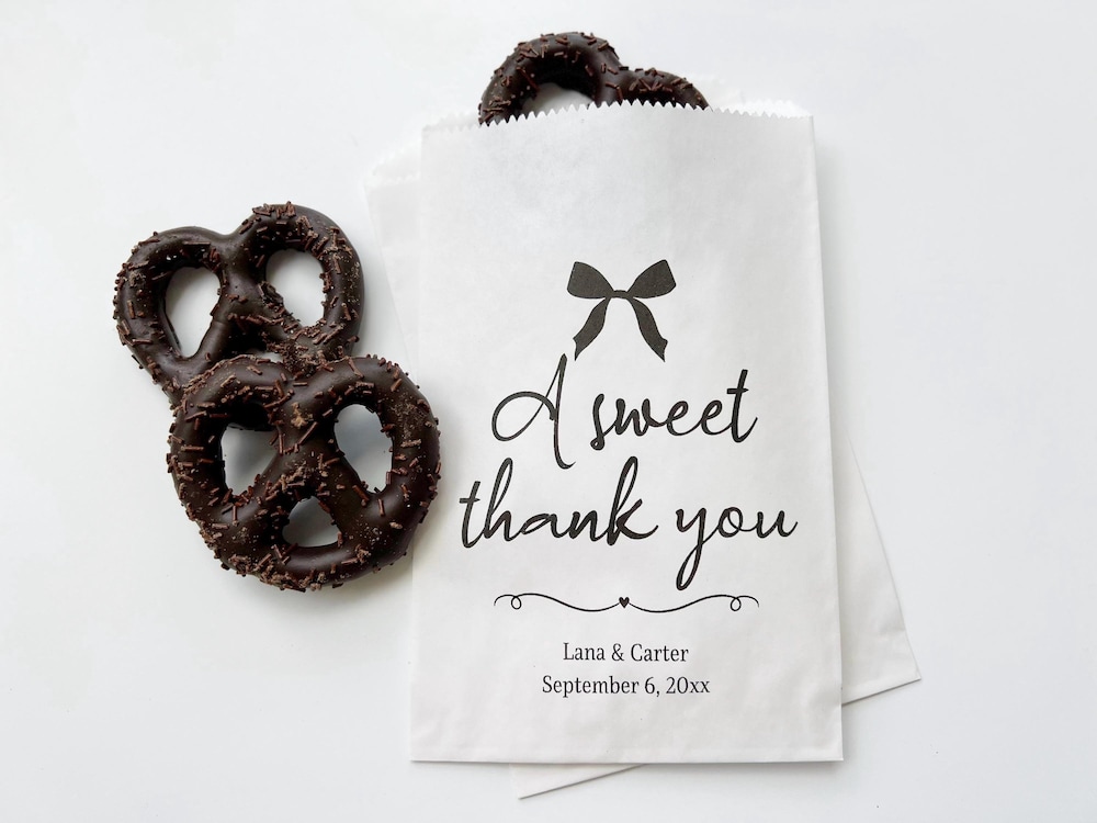 These “A Sweet Thank You” favor bags feature cute bow designs and are perfect for holding treats and small gifts for your bridal shower guests. These matte white paper bags have eco-friendly soy-based ink and are available with personalization options.Your guests will love the sophisticated black and white aesthetic that complements various themes and appreciate the take-home treats you fill them with for your special day.